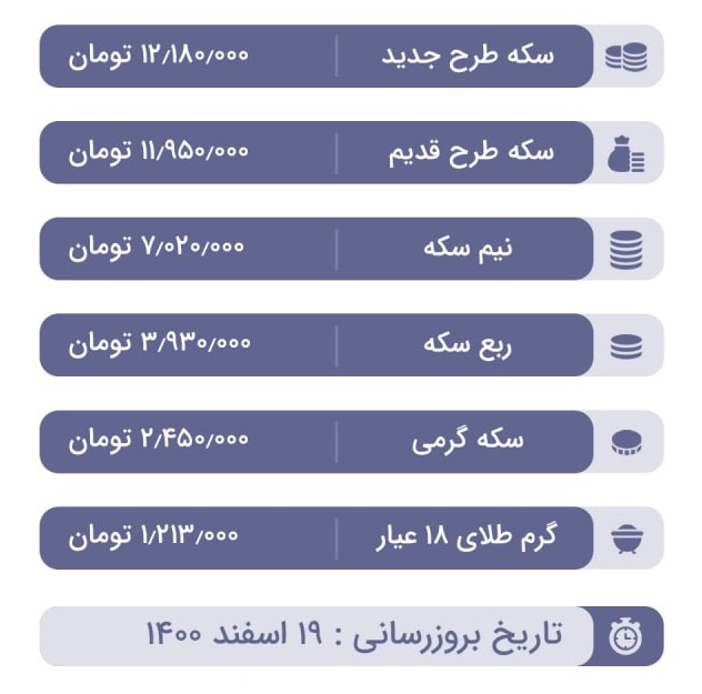 بر این اساس، امروز ۱۹ اسفند ۱۴۰۰ قیمت یک گرم طلای ۱۸ عیار یک میلیون و ۲۱۸ هزار تومان، قیمت سکه بهار آزادی ۱۲ میلیون و ۱۸۰ هزار تومان و قیمت سکه طرح قدیم ۱۱ میلیون و ۹۵۰ هزار تومان اعلام شده است.