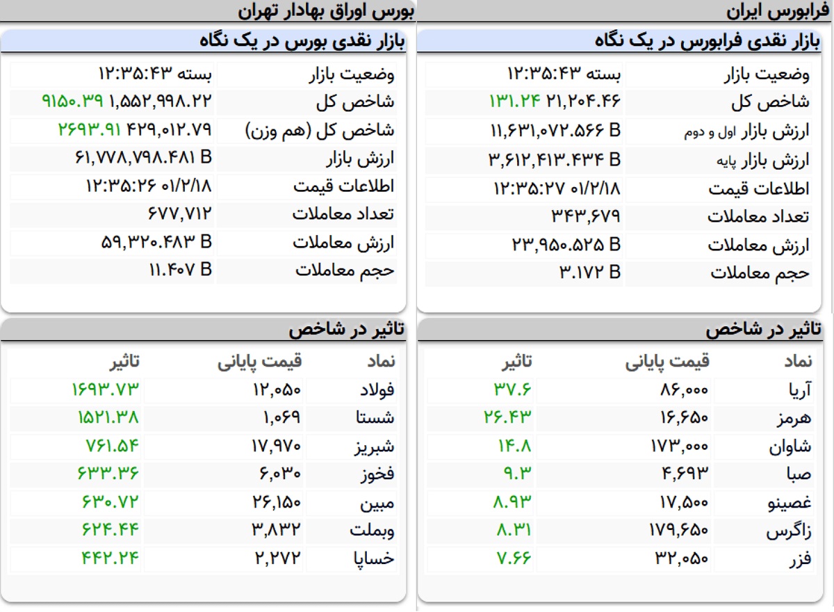 در آن سوی بازار سرمایه شاخص کل فرابورس با ۱۳۱ واحد افزایش در رقم ۲۱ هزار و ۲۰۴ واحد ایستاد. معاملهگران این بازار ۳۴۴ هزار معامله انجام دادند که ۲۴ هزار و ۵۰۲ میلیارد ریال ارزش داشت.