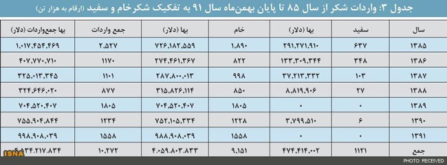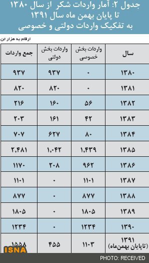 در 11 ماه منتهی به پایان بهمن ماه 1391 معادل یک میلیون و 103 هزار تن شکر توسط بخش خصوصی و 455 هزار تن توسط دولت وارد شد. نکته جالب اینجاست که واردات شکر دولتی پس از چند سال دوباره در سال گذشته از سر گرفته شد. در سال‌های 1387 تا 1390 دولت واردات شکر انجام نداده بود.