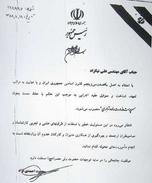 همزمان به عنوان سرپرست وزارت راه نیز مشخص می نماید خطاب به وی آمده است