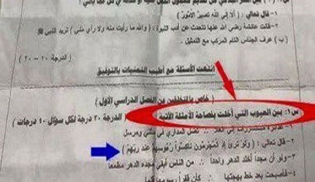 به نوشته روزنامه مصري "اليوم السابع"، طراح اين سوال از دانش آموزان خواسته بود درباره عيوبي که در جملات مشخص شده به بلاغت زبان خدشه وارد مي کند، توضيح دهند و آيه قرآني "ولو ترى إذ المجرمون ناکسو رءوسهم عند ربهم" ازجمله مثال هايي بود که براي اين سوال درنظر گرفته شده بود.