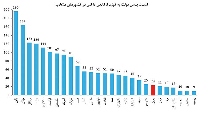 مقايسه نسبت بدهيهاي دولت به توليد ناخالص داخلياگرچه در حال حاضر رقم دقيق بدهيهاي دولت مشخص نيست، اما طبق اظهارات وزير امور اقتصادي و دارايي آخرين برآوردها نشان ميدهد که مجموع بدهيهاي دولت که عمدتا به نظام بانکي، پيمانکاران طرف قرارداد در طرحهاي تملک داراييهاي سرمايهاي و همچنين سازمانهاي بيمه و تامين اجتماعي است، حداکثر معادل 250 هزار ميليارد تومان است. در نتيجه برآورد ميشود نسبت بدهيهاي دولت به توليد ناخالص داخلي در حال حاضر حداکثر ۲۳ درصد است. با بهدست آوردن نسبت بدهيهاي دولت به توليد ناخالص داخلي و