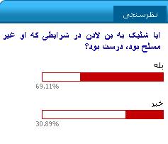 خبرگزاری انتخاب، طی یک نظرسنجی، دیدگاه خوانندگان سایت را در مورد این مساله خواستار شده است. طی این نظرسنجی که از روز جمعه روی سایت قرار گرفته است، 11 هزار نفر از خوانندگان به این سوال که ""آیا شلیک به بن لادن در شرایطی که او غیرمسلح بود، درست بود؟" پاسخ داده‌اند.