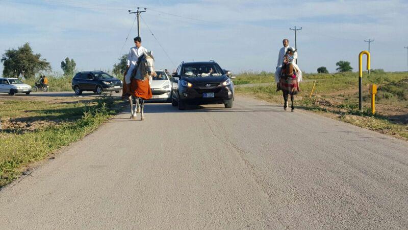 در بخش دیگری از مراسم هم اهالی روستا سوار بر اسب، از ماشین عروس استقبال و عروس و داماد را همراهی کردند.