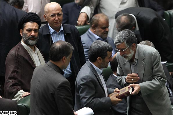 عکس: خوش و بش احمدی نژاد و لاریجانی/ اهدای کتاب منتشر نشده حداد به احمدی نژاد