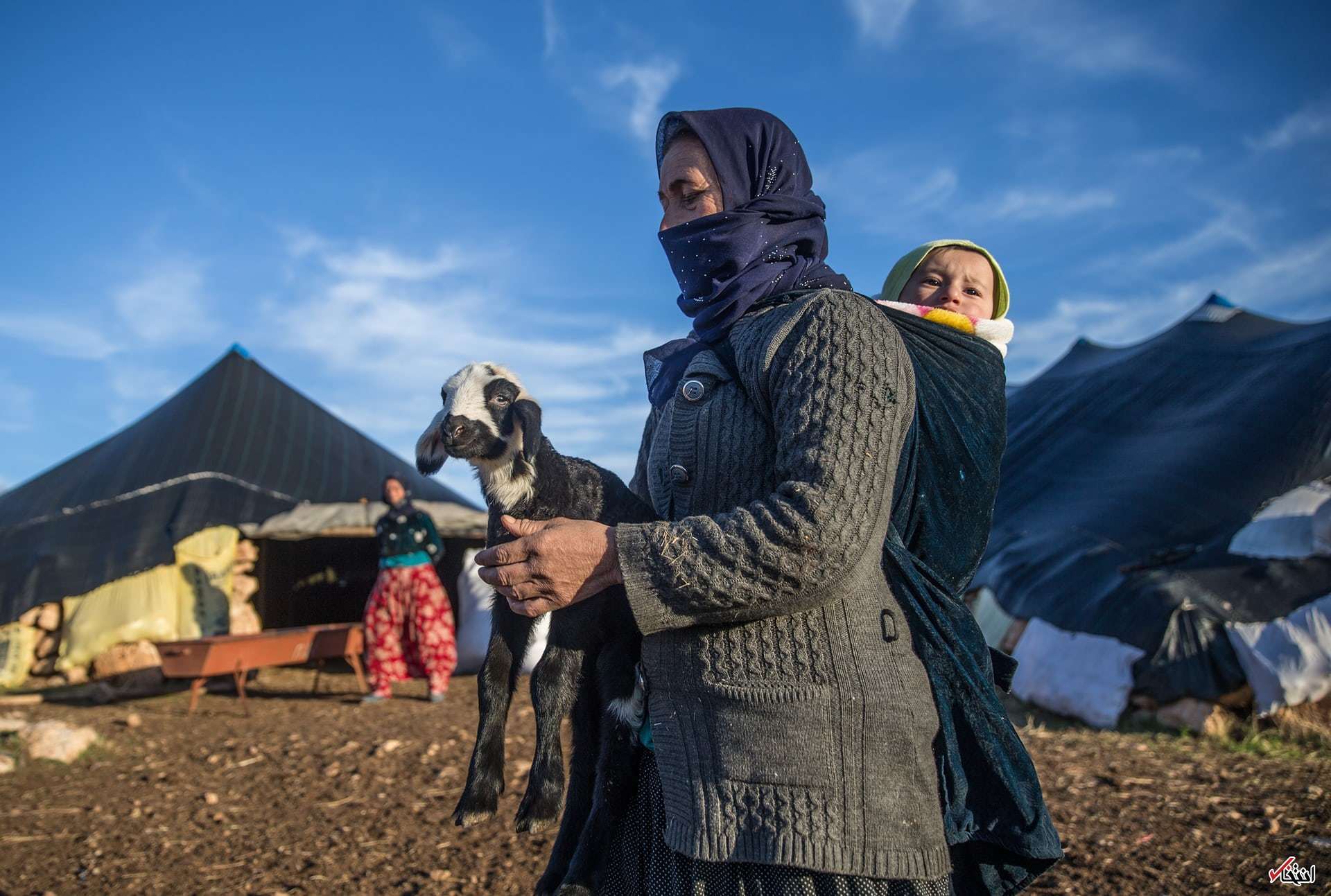 یک زن عشایری با بره تازه متولد شده و نوزادی بر پشت در شانلی اورفه ترکیه