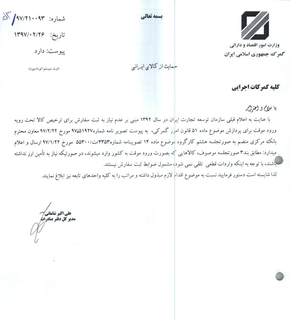 گمرک جمهوری اسلامی ایران با صدور بخشنامه ای به گمرکات اجرایی کشور اعلام کرد: با عنایت به اعلام قبلی سازمان توسعه تجارت ایران در سال ۱۳۹۲ مبنی بر عدم نیاز به ثبت سفارش برای ترخیص کالاهای تحت رویه ورود موقت برای پردازش موضوع ماده ۵۱ قانون امور گمرکی، به پیوست تصویر نامه شماره ۹۷.۵۱۹۲۷ مورخ ۲۲ اردیبهشت ۹۷ معاون محترم بانک مرکزی به منضم صورتجلسه هشتم کارگروه موضوع ماده ۱۴ تصویبنامه شماره ۵۵۳۰۰.ت. ۴۳۵۳ مورخ ۹۷.۱.۲۲ ارسال و اعلام میدارد: مطابق بند ۳ صورتجلسه موصوف، کالاهایی که به صورت موقت به کشور وارد می شوند، در صورتی که نیاز به تامین ارز نداشته باشند، با توجه به اینکه واردات قطعی تلقی نمی شود، مشمول ضوابط ثبت سفارش نیستند.