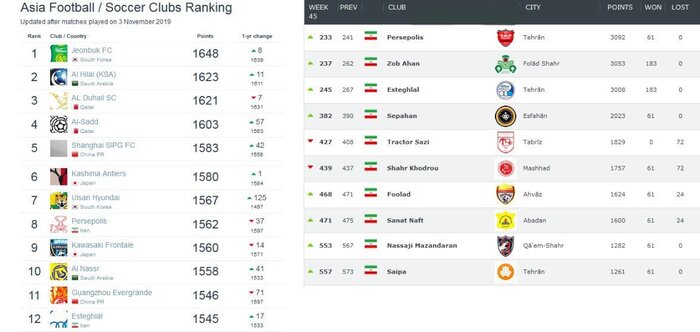 آخرین ردهبندی باشگاهی ایران و آسیا در ابتدای ماه نوامبر میلادی، از نگاه کلابوورلد رنکینگ و فوتبال دیتابیس منتشر شده که بر این اساس تیم فوتبال پرسپولیس با 1562 امتیاز در رده هشتم آسیا و اول ایران قرار دارد.