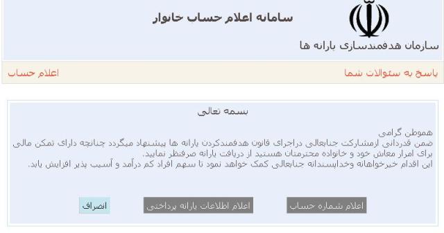 ضمن قدردانی ازمشارکت جنابعالی دراجرای قانون هدفمندکردن یارانه ها پیشنهاد میگردد چنانچه دارای تمکن مالی برای امرار معاش خود و خانواده محترمتان هستید از دریافت یارانه صرفنظر نمایید.
