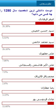 در این نظرسنجی که مجموعاً 45328 نفر طی 72 ساعت در آن شرکت داشتند، اصغر فرهادی با کسب 35/38% را کسب کرد.