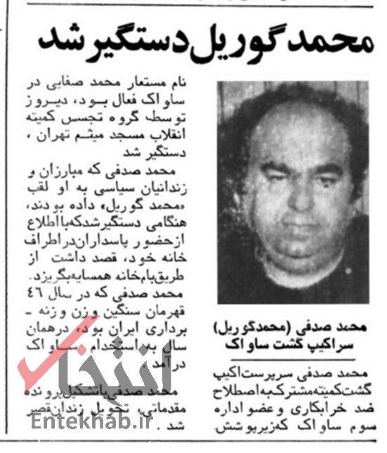 سرویس تاریخ «انتخاب»: محمد صدفی سرپرست اکیپ گشت کمیته مشترک به اصطلاح قصد خرابکاری و عضو اداره سوم ساواک که زیر پوشش نام مستعار محمد صفایی در ساواک فعال بود دیروز (23 خرداد 1358) توسط گروه تجسس کمیته انقلاب مسجد میثم تهران دستگیر شد.