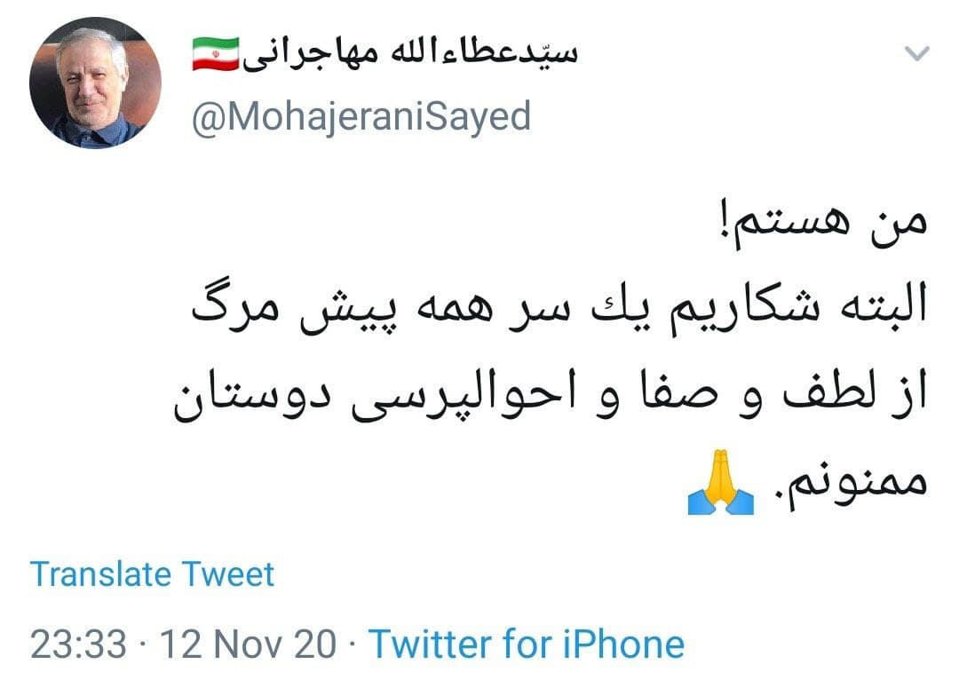 عطاالله مهاجرانی وزیر فرهنگ در دوران اصلاحات در پیامی توئیتری شایعه قتل خود را تکذیب کرد.