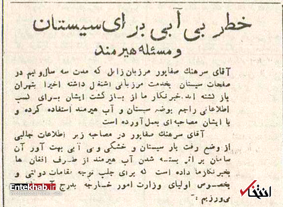 سرویس تاریخ «انتخاب»؛ سرهنگ صفاپور مرزبان زابل که از سال ۱۳۲۳ تا ۱۳۲۶ مدت سه سال در صفحات سیستان به خدمت مرزبانی اشتغال داشت، در اسفندماه ۱۳۲۶ طی گفتوگویی با خبرنگار روزنامه اطلاعات از وضع رقتبار سیستان و خشکی و بیآبی بهتآور آن سامان بر اثر بسته شدن آب هیرمند از طرف افغانها خبر داد. متن این گفتوگو که روز چهارشنبه ۱۹ اسفند ۱۳۲۶ در روزنامه اطلاعات منتشر شد به این شرح بود: