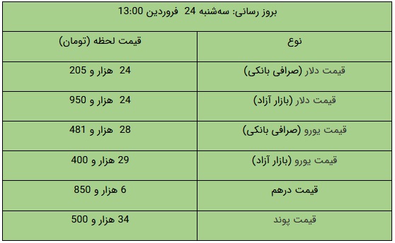 در صرافیهای بانکی قیمت دلار و یورو نسبت به روز کاری قبل کاهش یافته است؛ برهمین اساس، قیمت فروش دلار ۲۴ هزار و ۲۰۵ تومان و قیمت خرید دلار از مردم ۲۳ هزار و ۷۲۵ تومان تعیین شده است. قیمت فروش یورو نیز معادل ۲۸ هزار و ۴۸۱ تومان و قیمت خرید یورو نیز ۲۷ هزار و ۹۱۷ تومان اعلام شده است.