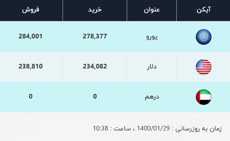 قیمت فروش یورو نیز در صرافیهای بانکها، ۲۸۴۰۰۱ ریال و نرخ خرید آن ۲۷۸۳۷۷ ریال اعلام شده است.