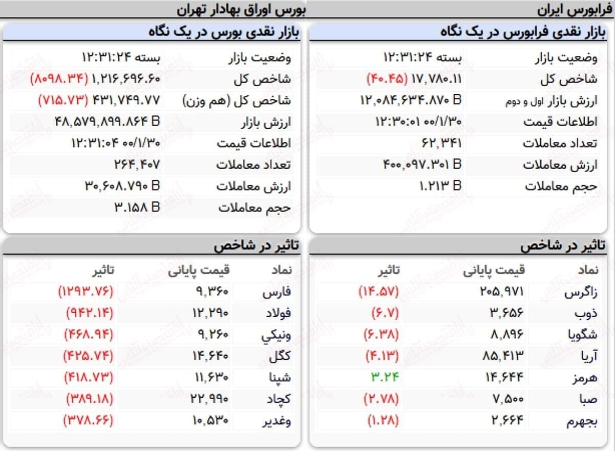 در مقابل پتروشیمی زاگرس (زاگرس)، سهامی ذوب آهن اصفهان (ذوب)، پتروشیمی تندگویان (شگویا)، پلیمر آریا ساسول (آریا)، سرمایه گذاری صبا تامین (صبا)، توسعه مولد نیروگاهی جهرم (بجهرم)، تولیدات پتروشیمی قائد بصیر (شبصیر)، سرمایه گذاری مس سرچشمه (سرچشمه)، پتروشیمی مارون (مارون)، بیمه پاسارگاد (بپاس) و گروه توسعه مالی مهر آیندگان (ومهان) تاثیر منفی بر شاخص فرابورس داشتند.