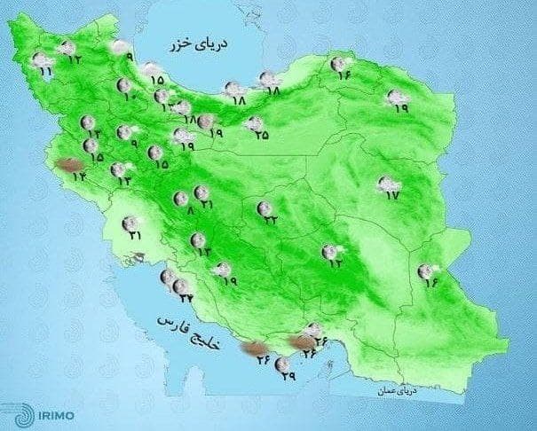 بر اساس نقشههای همدیدی و آیندهنگری سازمان هواشناسی با فعالیت سامانه بارشی روی کشور امروز به جز استانهای کرمانشاه، لرستان، ایلام بوشهر و فردا به جز استانهای کرمانشاه و ایلام در سایر مناطق کشور در برخی ساعات رگبار باران، وزش باد شدید موقتی، رعدوبرق و در برخی مناطق گردوخاک و در مناطق مستعد بارش تگرگ پیش بینی میشود.