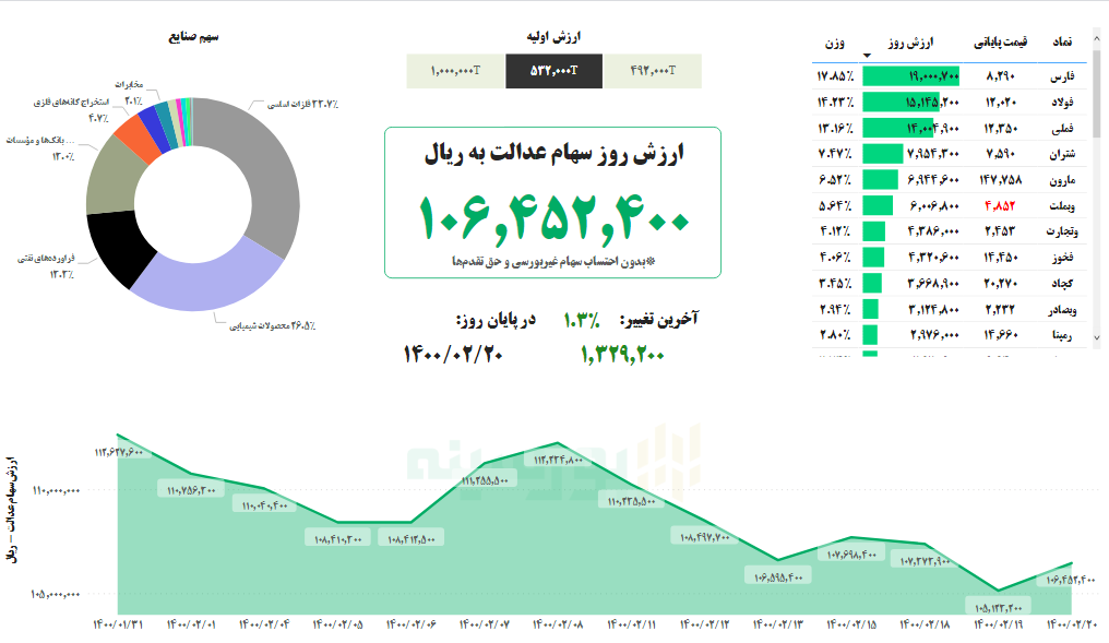 در پایان معاملات امروز بازار سهام، ارزش سهام عدالت در مقایسه با روز گذشته، ۱.۳درصد افزایش یافت و ارزش سبد ۵۳۲هزار تومانی و یک میلیون تومانی سهام عدالت به ترتیب به ۱۰ میلیون و ۶۴۵هزار تومان و ۲۰ میلیون و ۵۲هزار تومان رسید.