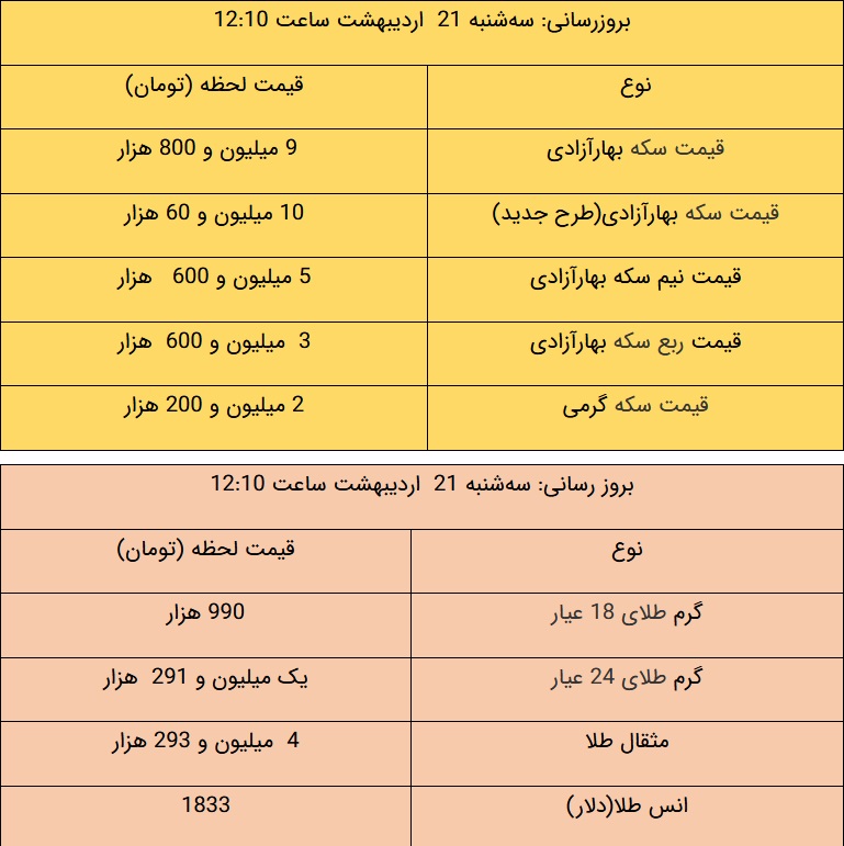 گفتنی است، به دلیل موج جدید کرونا و اعلام شرایط قرمز در تهران، بازار طلا و جواهر تهران نیز به مدت ۴ هفته تعطیل بود و از ۱۸ اردیبهشت ماه بعد از یک دوره تعطیلی، مجدداً فعالیت خود را آغاز کرده است. قیمتهای درج شده در این خبر با استناد به نرخهای اعلامی از سوی اتحادیه طلا و جواهر است.