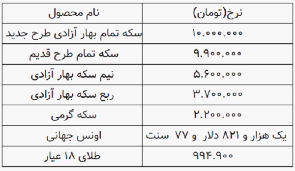 همچنین قیمت هر اونس طلا در بازارهای جهانی به یک هزار و ۸۲۱ دلار رسید و هر گرم طلای ۱۸ عیار به مبلغ ۹۹۴ هزار تومان معامله میشود.
