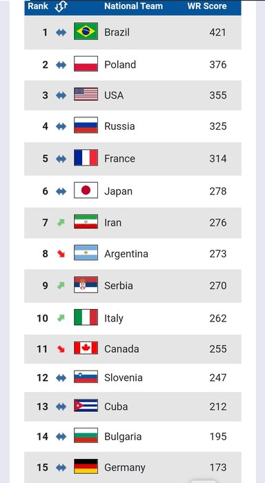 در صدر این رده‌بندی، همچنان برزیل، لهستان و آمریکا در رتبه‌های اول تا سوم قرار دارند.