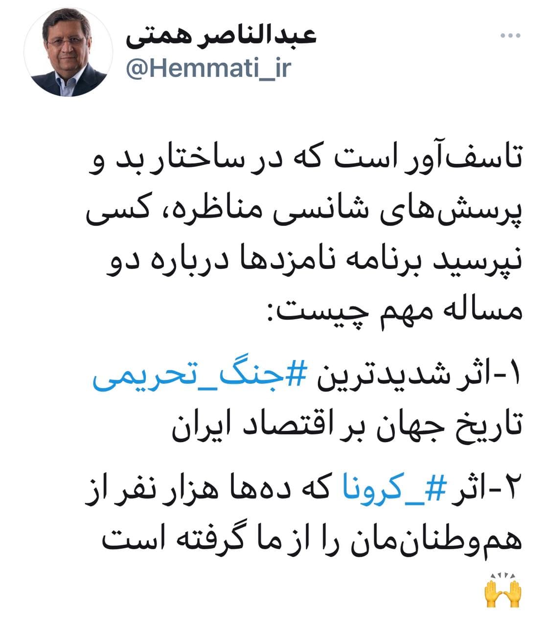 عبدالناصر همتی، نامزد انتخابات ریاست جمهوری در توییتر خود از صداوسیما به خاطر نپرسیدن سوال در خصوص بحران کرونا در مناظره اول انتقاد کرد.