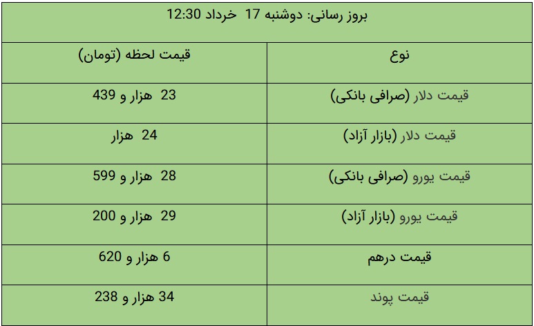 در صرافیهای بانکی قیمت دلار و یورو نسبت به روز کاری قبل افزایش یافته است؛ برهمین اساس، قیمت فروش دلار ۲۳ هزار و ۴۳۹ تومان و قیمت خرید دلار از مردم ۲۲ هزار و ۹۷۵ تومان تعیین شده است. قیمت فروش یورو نیز معادل ۲۸ هزار و ۵۹۹ تومان و قیمت خرید یورو نیز ۲۸ هزار و ۳۲ تومان اعلام شده است.