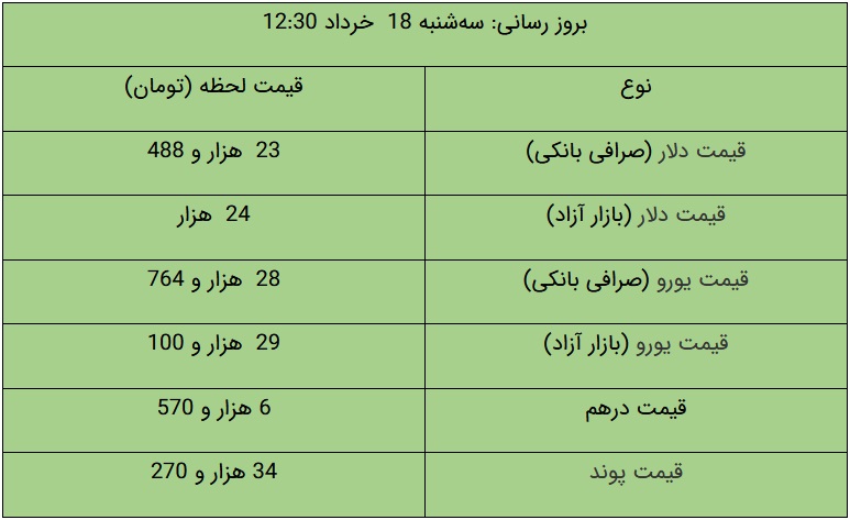 در صرافیهای بانکی قیمت دلار و یورو نسبت به روز کاری قبل افزایش یافته است؛ برهمین اساس، قیمت فروش دلار ۲۳ هزار و ۴۸۸ تومان و قیمت خرید دلار از مردم ۲۳ هزار و ۲۳ تومان تعیین شده است. قیمت فروش یورو نیز معادل ۲۸ هزار و ۷۶۴ تومان و قیمت خرید یورو نیز ۲۸ هزار و ۱۹۵ تومان اعلام شده است.