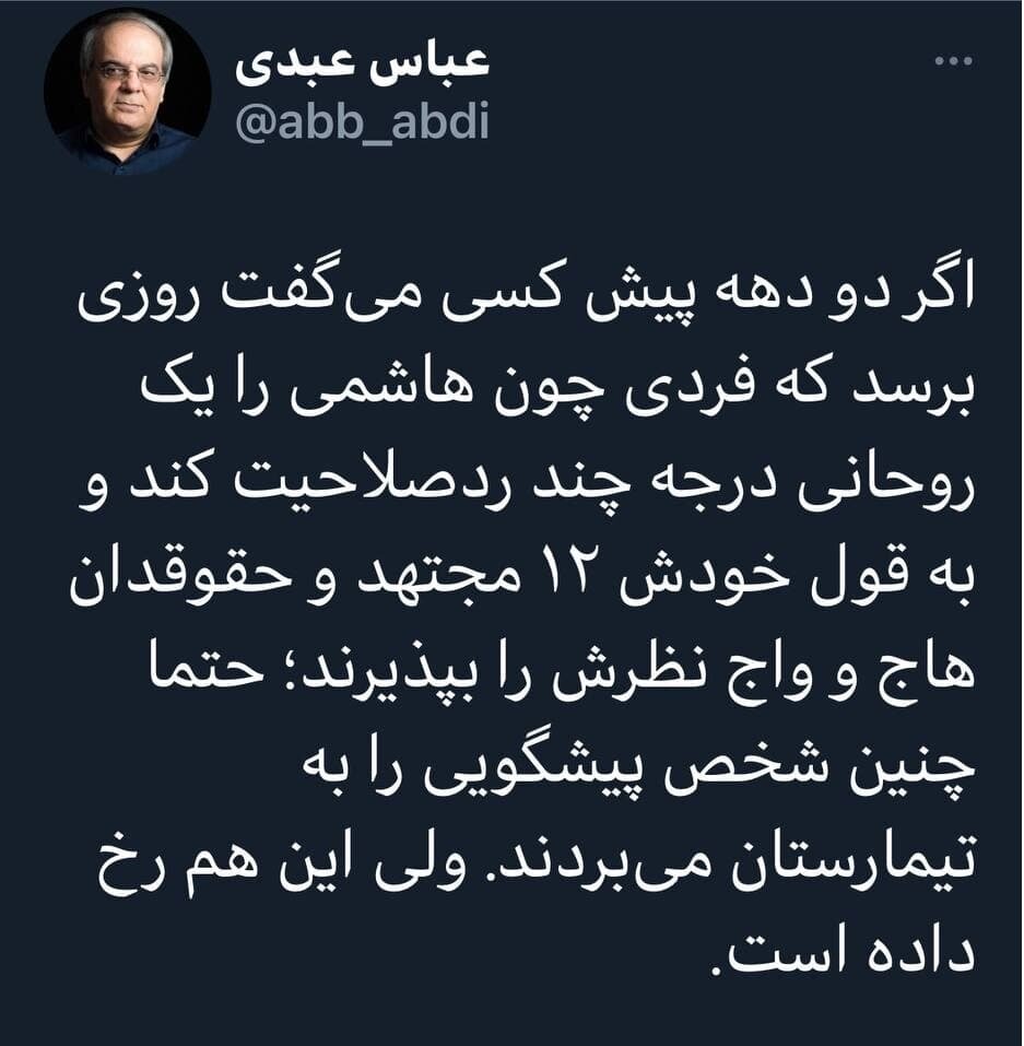 عباس عبدی در توئیتی نوشت: اگر دو دهه پیش کسی میگفت روزی برسد که فردی چون هاشمی را یک روحانی درجه چند ردصلاحیت کند و به قول خودش ۱۲ مجتهد و حقوقدان هاج و واج نظرش را بپذیرند؛ حتما چنین شخص پیشگویی را به تیمارستان میبردند. ولی این هم رخ داده است.