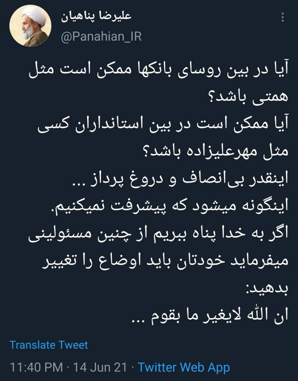 حجت الاسلام علیرضا پناهیان در توئیتی به همتی و علیزاده دو نامزد انتخابات ریاست جمهوری حمله کرد.