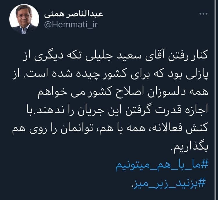 همتی با هشتگ ما با هم میتوانیم و بزنید زیرمیز نوشت: کنار رفتن آقای سعید جلیلی تکه دیگری از پازلی بود که برای کشور چیده شده است.