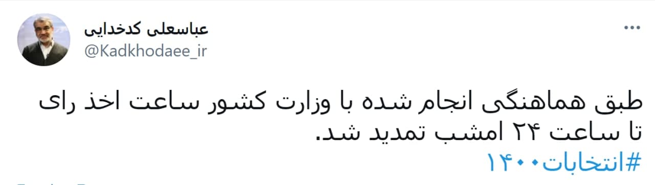 کدخدایی سخنگوی شورای نگهبان در توئیتی از تمدید ساعت رای گیری تا تا ساعت ۲۴ امشب خبر داد. سخنگوی شورای نگهبان در این توئیت نوشت: طبق هماهنگی انجام شده با وزارت کشور ساعت اخذ رای تا ساعت ۲۴ امشب تمدید شد.