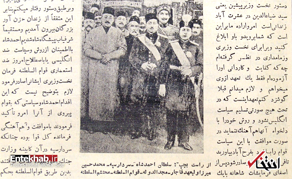 بعد از زمامداری صد روزهی سید ضیاءالدین، روزی طرف عصر سردار سپه [رضاخان] که در آن موقع فرماندهی کل قوا بود در فرحآباد به ملاقات احمدشاه آمد و مدتی دور از ما با هم صحبت کردند. پس از بازگشت سردارسپه احمدشاه مرا احضار کرده فرمودند: «شهابالدوله! چنانکه میدانید قوامالسلطنه بنا بر دستور نخستوزیر پیشین یعنی سید ضیاءالدین در عشرتآباد زندانی است، امر و ارادهی ما بر این است که شما بروید و به او ابلاغ کنید وی را برای نخستوزیری و زمامداری در نظر گرفتهام چه که کفایت و کاردانی او را آزمودهام فقط یک تعهد از وی میخواهم و لازم میدانم قبلا گوشزد کنم؛ تعهد این است که در تحت هیچ صورتی تسلیم سیاست انگلیس نشود و روش خود را با دلخواه آنها همآهنگ ننماید در صورت موافقت با این سیاست قوام را با خود به فرحآباد بیاورید تا فرمان زمامداری او صادر شود.»