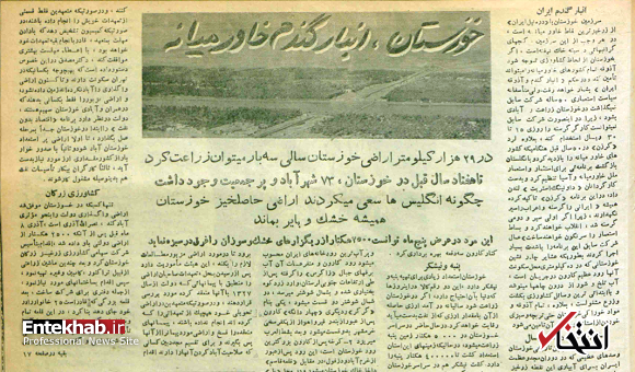 سرویس تاریخ «انتخاب»؛ «خوزستان انبار گندم خاورمیانه» را نویسنده‌ای که نامش بر ما معلوم نیست در ۶۹ سال پیش درباره‌ی ظرفیت‌های کشاورزی استان خوزستان در شماره‌ی ۴۹۰ مجله‌ی تهران مصور (مورخ جمعه ۱۲ دی ۱۳۳۱، صص ۷ و ۱۷) نوشته است، ظرفیت‌هایی که به زعم او تا پیش از ملی شدن صنعت نفت به خاطر روند استعماری شرکت نفت ایران و انگلیس از آن عمدا بهره‌برداری نمی‌شد، و حالا یعنی در زمان نوشتن این مقاله که دست استعمار انگلیس از جنوب ایران کوتاه شده می‌توان از آن بهره برد. آن‌چه نویسنده در این مطلب بیش‌تر بر آن تاکید می‌کند، بستر مناسب این استان برای کشاورزی است به طوری که به عقیده‌ی او می‌تواند به انبار گندم خاورمیانه تبدیل شود، نگاهی که نتایج‌ زیان‌بارش امروز بیش از هر زمان دیگری در پیش دیدگان‌مان است. مقاله‌ی ۶۹ سال پیش تهران مصور را در پی می‌خوانید:
