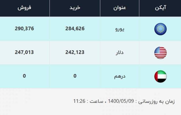 قیمت فروش یورو نیز در صرافیهای بانکها، ۲۹۰۳۷۶ ریال و نرخ خرید آن ۲۸۴۶۲۶ ریال اعلام شده است.