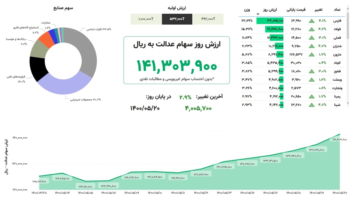 در پایان معاملات امروز بازار سهام، ارزش سهام عدالت در مقایسه با روز گذشته، ۲.۹درصد افزایش یافت و ارزش سبد ۵۳۲هزار تومانی و یک میلیون تومانی سهام عدالت به ترتیب به ۱۴ میلیون و ۱۳۰هزار تومان و ۲۶ میلیون و ۶۱۳هزار تومان رسید.