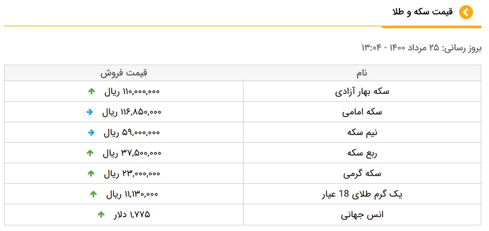 قیمت طلا و سکه، امروز ۲۵ مرداد ۱۴۰۰