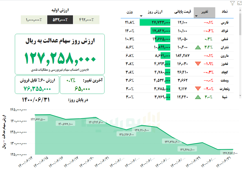 در پایان معاملات امروز بازار سهام، ارزش سهام عدالت درمقایسه با روز گذشته، ۰.۱درصد افزایش یافت و ارزش سبد ۵۳۲هزار تومانی و یک میلیون تومانی سهام عدالت به ترتیب به ۱۲ میلیون و ۷۲۵هزار تومان و ۲۳ میلیون و ۹۷۱هزار تومان رسید.