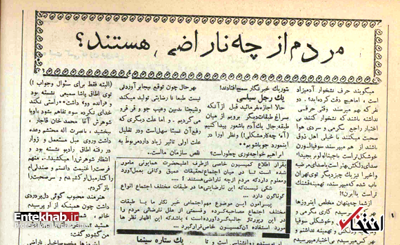 سرویس تاریخ «انتخاب»؛ ۶۳ سال پیش خبرنگار مجلهی سپید و سیاه (شمارهی مسلسل ۲۶۴، جمعه ۴ مهر ۱۳۳۷، صص ۱۲-۱۳ و ۷۷) از مردم سوال جالبی پرسید، سوال این بود: «از چه ناراضی هستید؟» مخاطبان یک روانشناس، یک روزنامهنگار، یک هنرپیشه و یک دستفروش بودند. پاسخ آنان را در پی میخوانید: