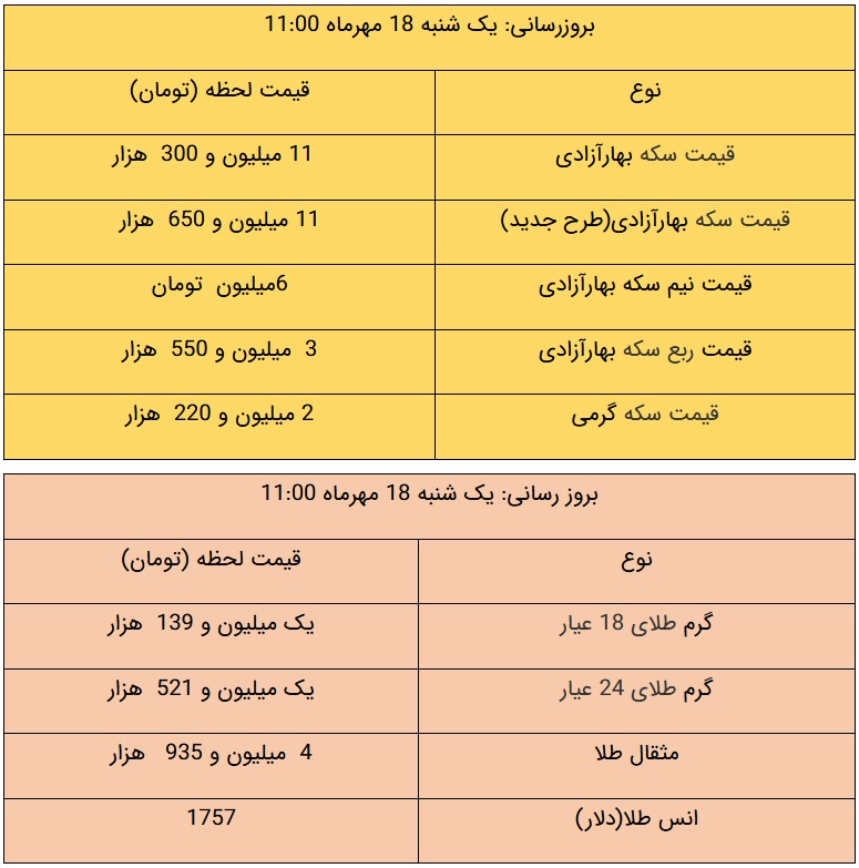 در بازار سبزهمیدان هماکنون، قیمت نیمسکه بهار آزادی ۶ میلیون تومان، ربعسکه بهار آزادی ۳ میلیون و ۵۵۰ هزار تومان و سکه یکگرمی ۲ میلیون و ۲۲۰ هزار تومان تعیین شده است و به فروش میرسد.