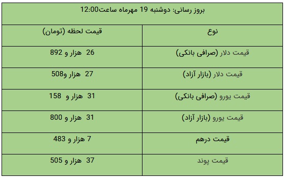 علاوه بر این، در صرافیهای بانکی قیمت فروش دلار ۲۶ هزار و ۸۹۲ تومان و قیمت خرید دلار از مردم ۲۶ هزار و ۳۶۰ تومان تعیین شده است. قیمت فروش یورو نیز معادل ۳۱ هزار و ۱۵۸ تومان و قیمت خرید یورو نیز ۳۰ هزار و ۵۴۱ تومان اعلام شده است.