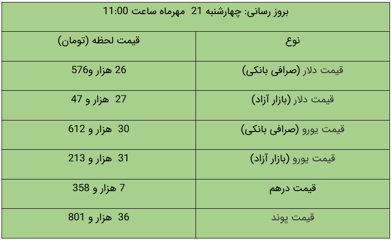 علاوه بر این، در صرافی‌های بانکی قیمت فروش دلار ۲۶ هزار و ۵۷۶ تومان و قیمت خرید دلار از مردم ۲۶ هزار و ۴۹ تومان تعیین شده است. قیمت فروش یورو نیز معادل ۳۰ هزار و ۶۱۲ تومان و قیمت خرید یورو نیز ۳۰ هزار تومان اعلام شده است.