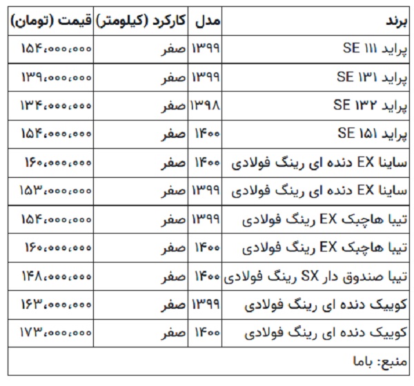 اقتصادآنلاین: گزارش ها در بازار خودرو نشان می دهد که تیبا ۱۶۰ میلیون تومان قیمت پیدا کرده است. در جدول بالا قیمت روز انواع پراید، تیبا، کوییک و ساینا در بازار آزاد را مشاهده می‌کنید.