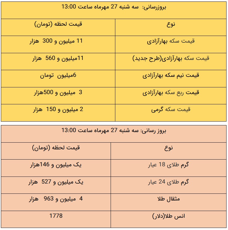 قیمت طلا و سکه، امروز ۲۷ مهر ۱۴۰۰