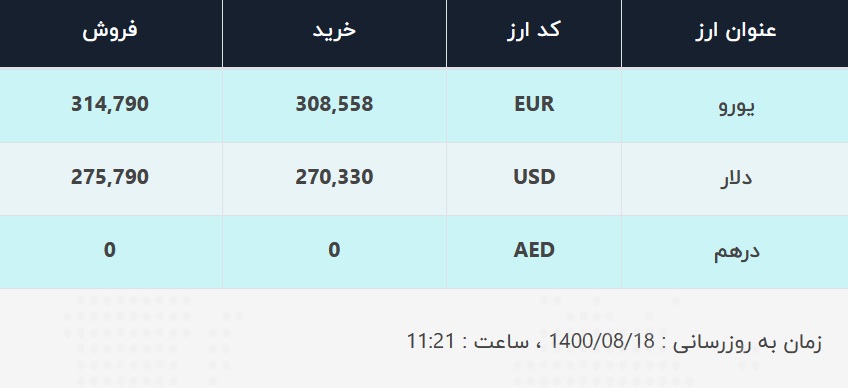 صرافیهای بانکها صبح امروز ۱۸ آبان ۱۴۰۰ قیمت دلار را برای فروش به مردم ۲۷۵,۷۹۰ ریال اعلام کردهاند که نسبت به آخرین قیمتهای روز کاری گذشته افزایش یافته است. نرخ خرید در این صرافیها نیز ۲۷۰,۳۳۰ ریال است.