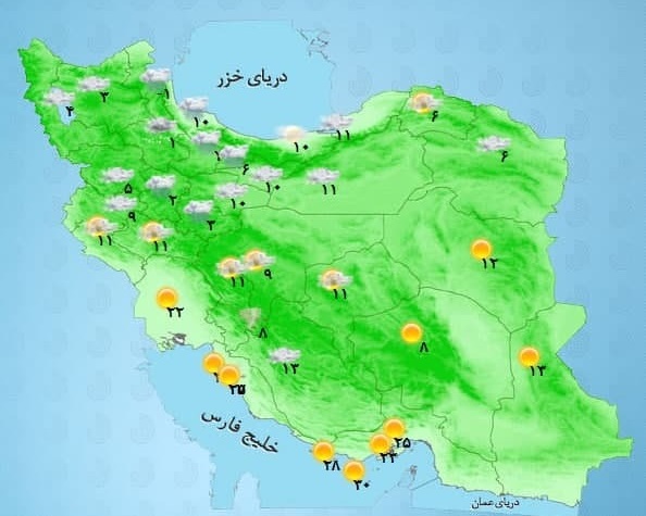 یکشنبه و دوشنبه در غالب مناطق کشور جو آرام بوده و مجددا با افزایش غلظت آلایندههای جوی مواجه خواهیم بود. سه شنبه با ورود سامانه بارشی از شمال غرب کشور بارش باران و بر در شمال غرب، دامنهها و ارتغاعات البرز و سواحل دریای خزر آغاز خواهد شد. امروز خلیج فارس و دریای خزر مواج هستند.