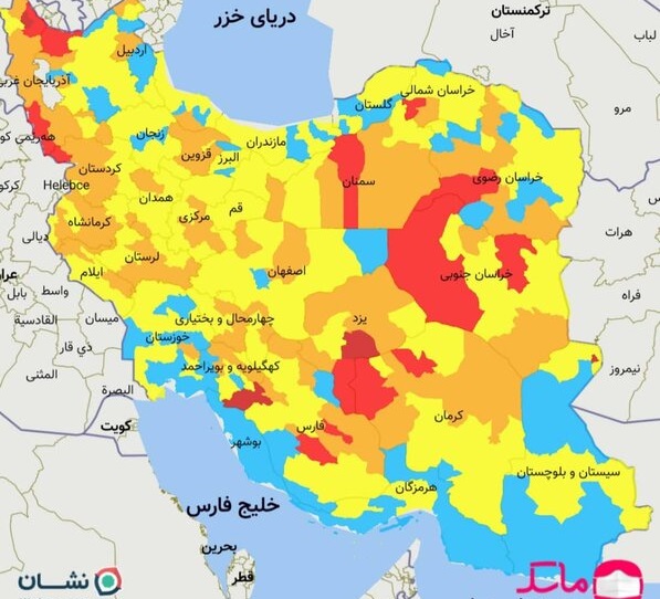 نقشه جدید رنگ‌بندی کرونا در ایران؛ شهرهای قرمز کاهش یافت / بوشهر و زاهدان آبی شدند