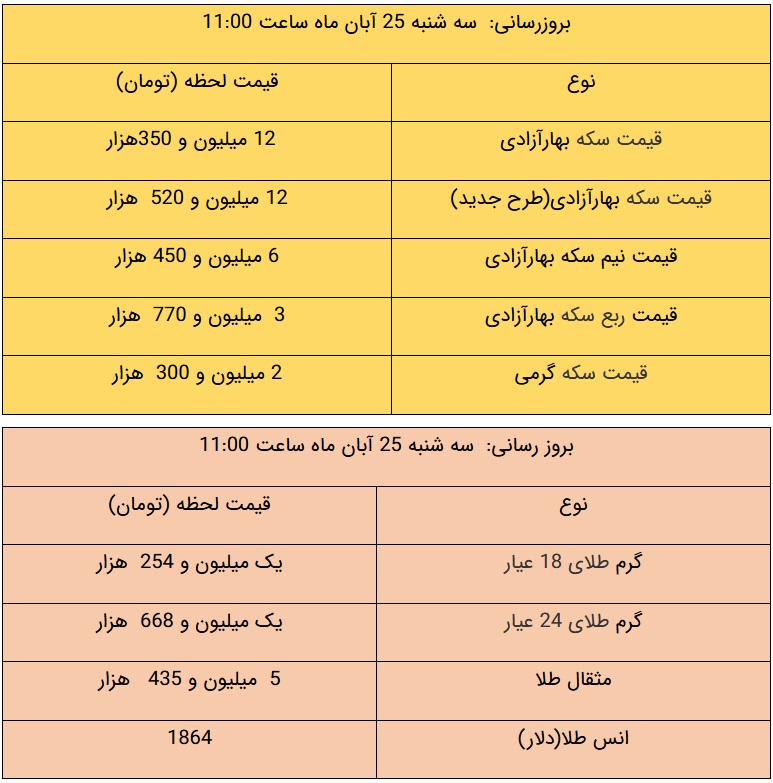 قیمت طلا و سکه، امروز ۲۵ آبان ۱۴۰۰