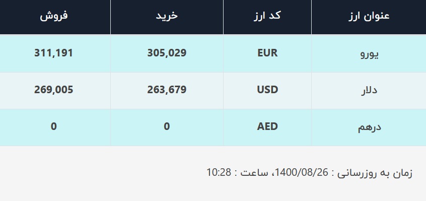 صرافی‌های بانک‌ها صبح امروز ۲۶ آبان ۱۴۰۰ قیمت دلار را برای فروش به مردم ۲۶۹۰۰۵ ریال اعلام کرده‌اند که نسبت به آخرین قیمت‌های روز کاری گذشته کاهش یافته است. نرخ خرید در این صرافی‌ها نیز ۲۶۳۶۷۹ ریال است.
