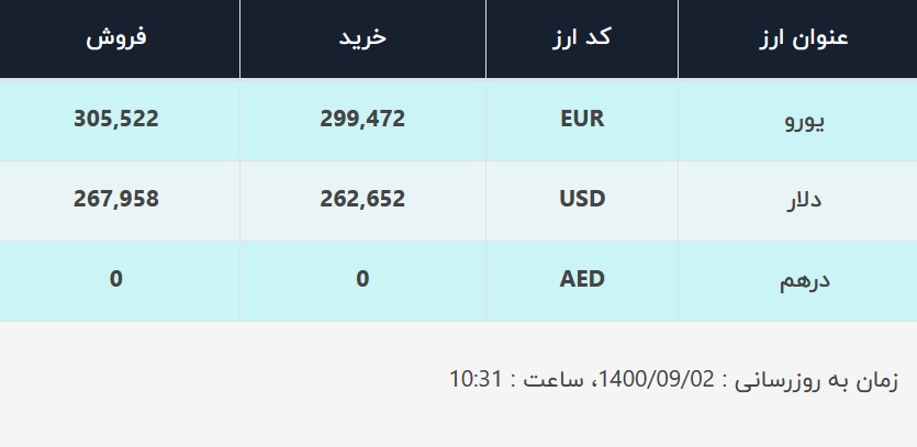 قیمت فروش یورو نیز در صرافیهای بانکها، ۳۰۵۵۲۲ ریال و نرخ خرید آن ۲۹۹۷۴۲ ریال اعلام شده است.